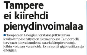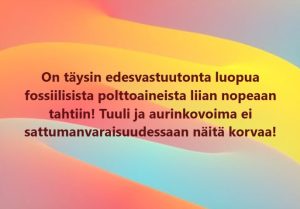 Tuulivoiman osuus on noin 1/4 osa koko maamme energiantuotannosta. Aurinkovoiman osuus on häilyvän pieni. Näihin ”tuotantolähteisiin” tukeutuminen näyttää olevan muotiasia, joka on osa ilmastomuutospaniikin kylvämistä. Aurinkovoima on, pelkästään maamme sijaintia kartalla katsottaessa satunnaista energiaa, joka soveltuu valtakunnan tasolla peittämään lähinnä verkostohäviöitä. Aurinkosähkö soveltuu, vaikka on kallista, vain asuntojen tukisähkön tuottajaksi.